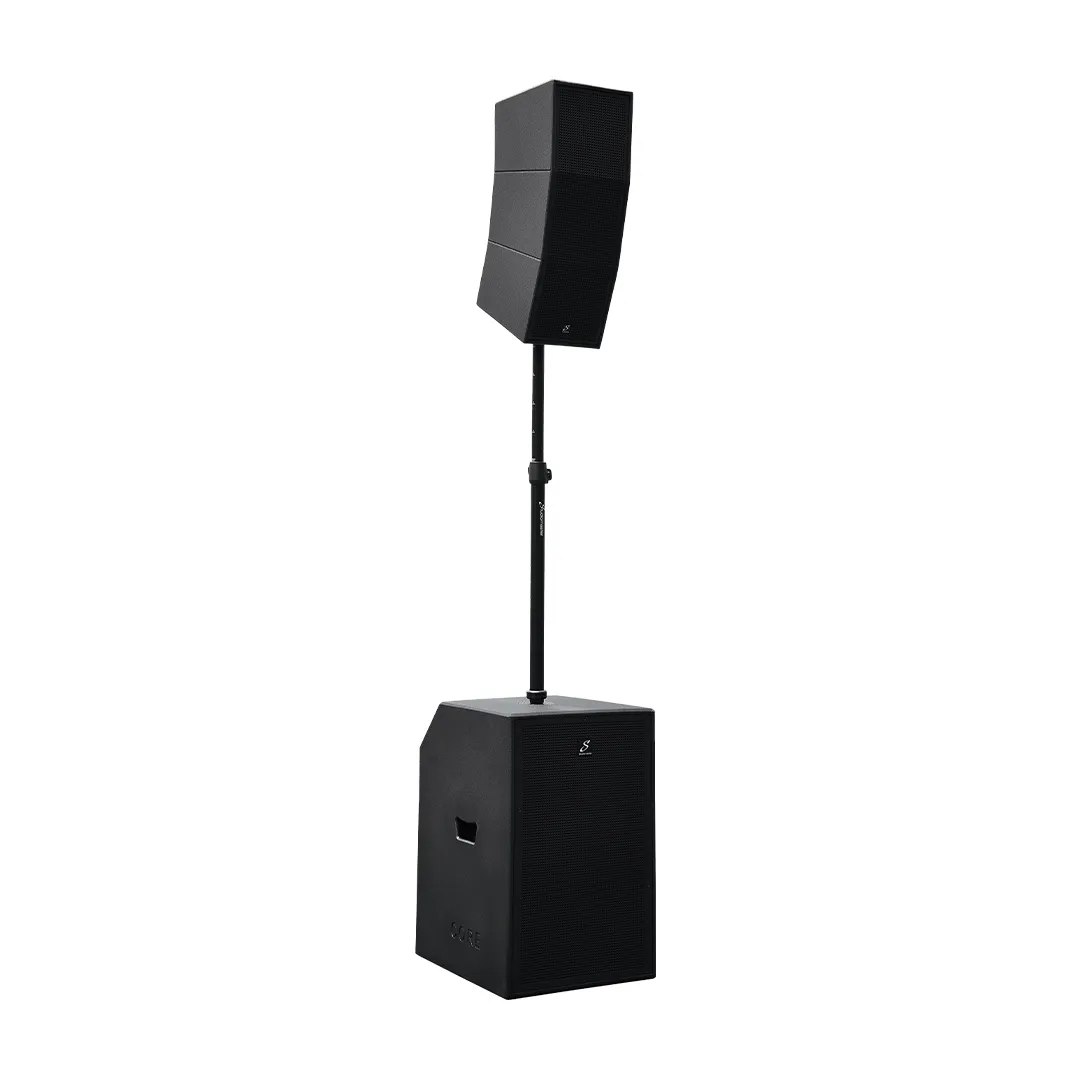 El sistema CORE está diseñado para ser fácil de instalar y usar. El poste del altavoz ajustable con suspensión neumática incluye cableado interno, así que simplemente levántelo y coloque el ligero sistema curvo sobre el poste. ¡Conéctelo a la fuente de alimentación y listo!
