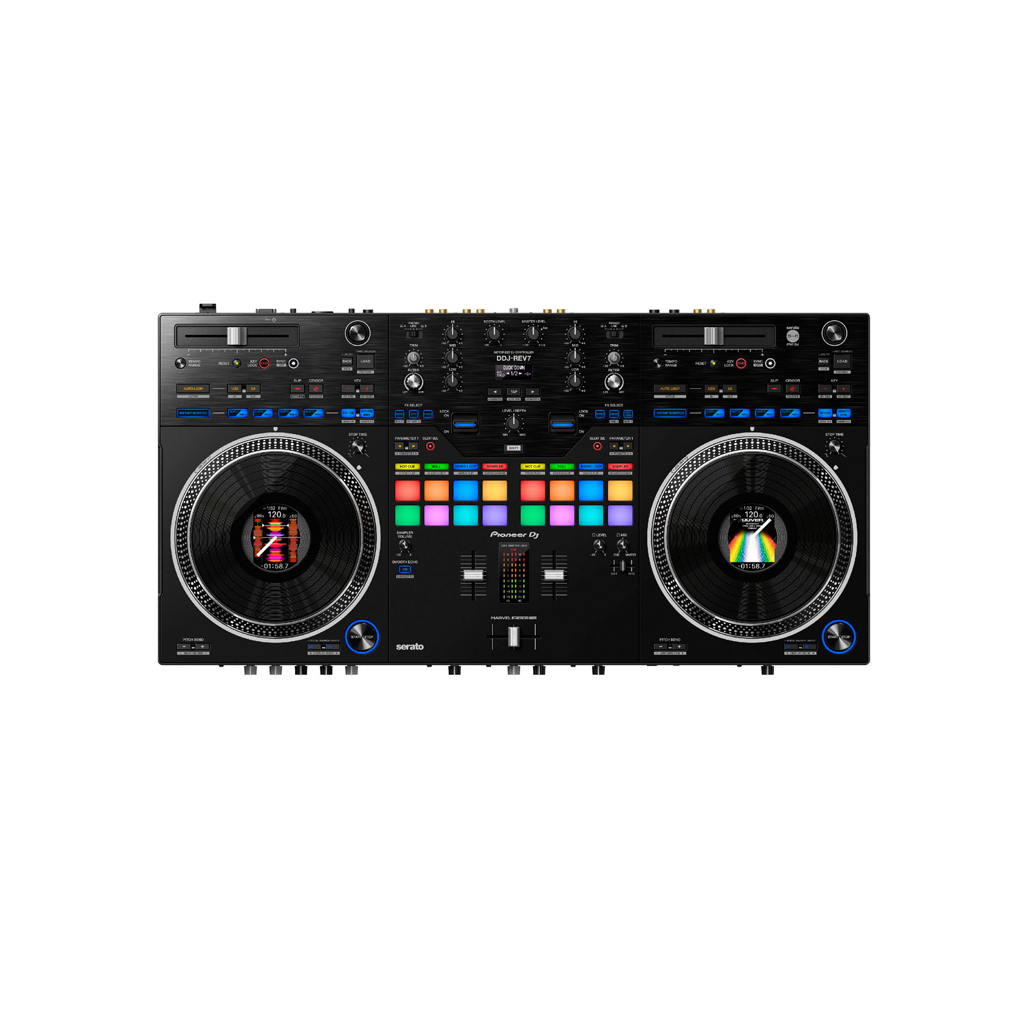 El DDJ-REV7 está construido para ayudarte a sacar el máximo provecho del software de performance Serato DJ Pro y cuenta con un diseño totalmente nuevo que incluye ruedas jog grandes y motorizadas con pantalla On Jog para crear una conexión táctil entre tú y tu música. El diseño de esta unidad de 2 canales emula la configuración profesional de una mezcladora DJM-S y una tornamesa PLX, e incluye funciones especializadas para DJs de formato abierto y de scratch.