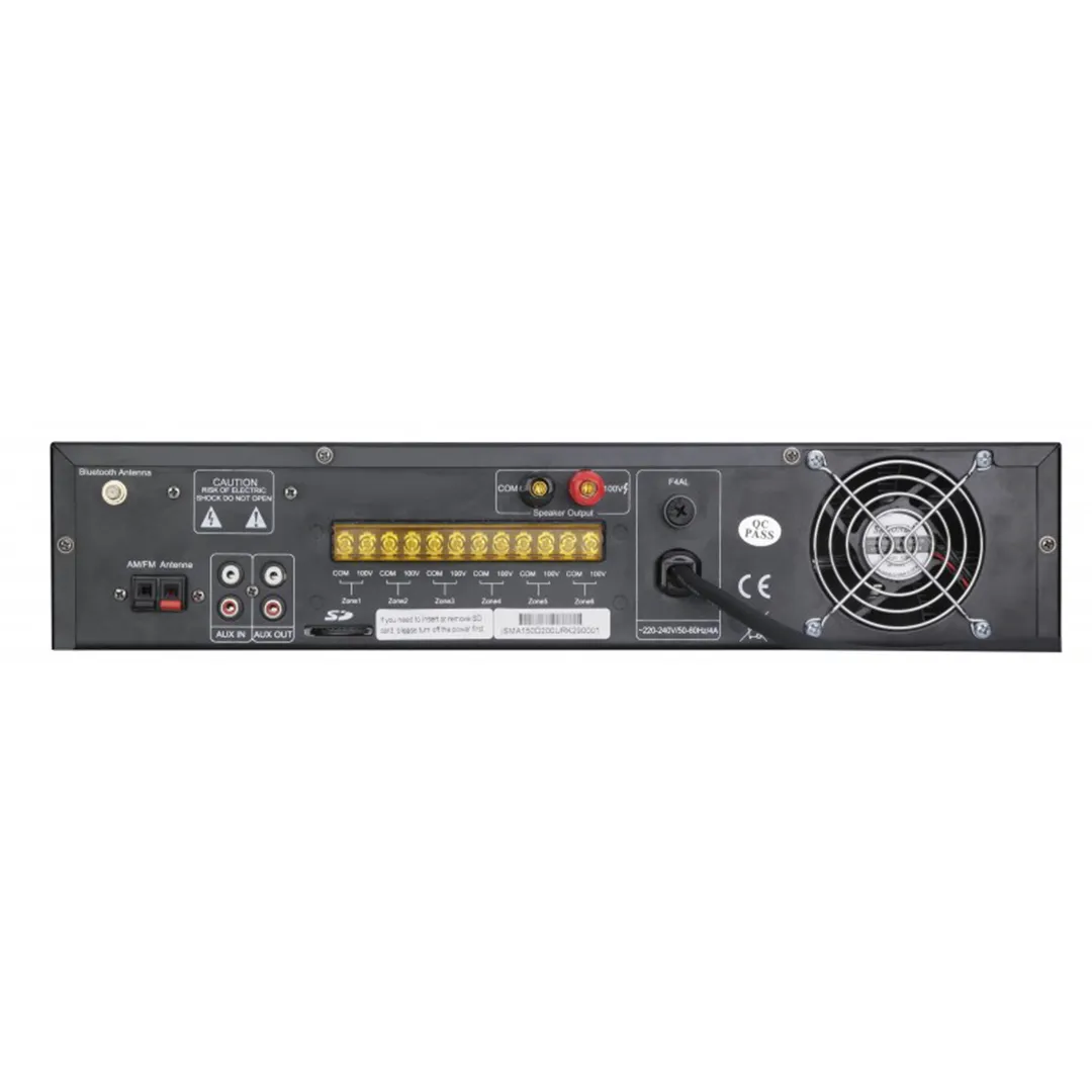 - 2 micrófonos, 3 entradas de línea, 150 W 100 V línea 6 salidas seleccionables de zona