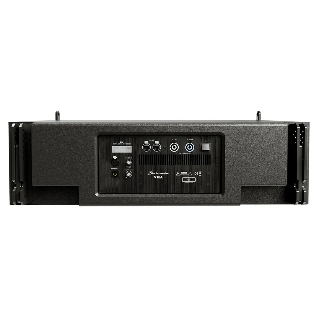 Los modelos activos V10 no solo cuentan con módulos amplificadores CLASE D livianos y de alta potencia junto con unidades de fuente de alimentación duraderas, sino que también cada gabinete está equipado con un DSP integral de 56 bits y 96 kHz, que presenta ganancia, cruce, fase, retardo, limitación única y tres configuraciones de programa predeterminadas útiles.